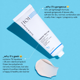 Výživný, ale ľahký hydratačný krém so skvalánom, lipidmi identickými s pokožkou + polyfenolmi zo zeleného čaju pre zdravú kožnú bariéru a super jemnú pokožku.